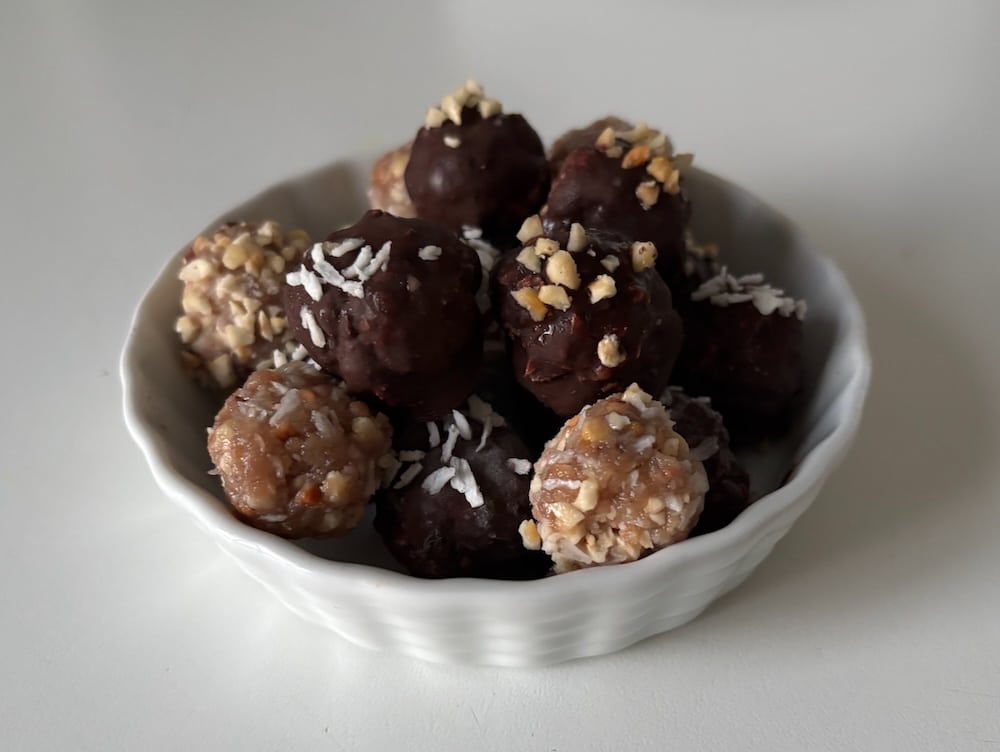Form into balls and roll in grated coconut or coat with melted chocolate.