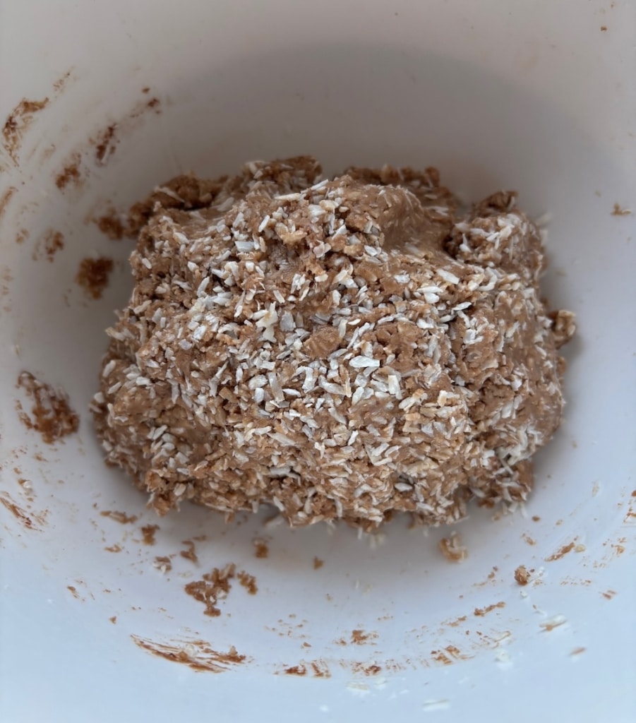 Then add in the grated coconut. You can add more coconut if you like the balls to be really stiff. I use my hands to properly kneel them.