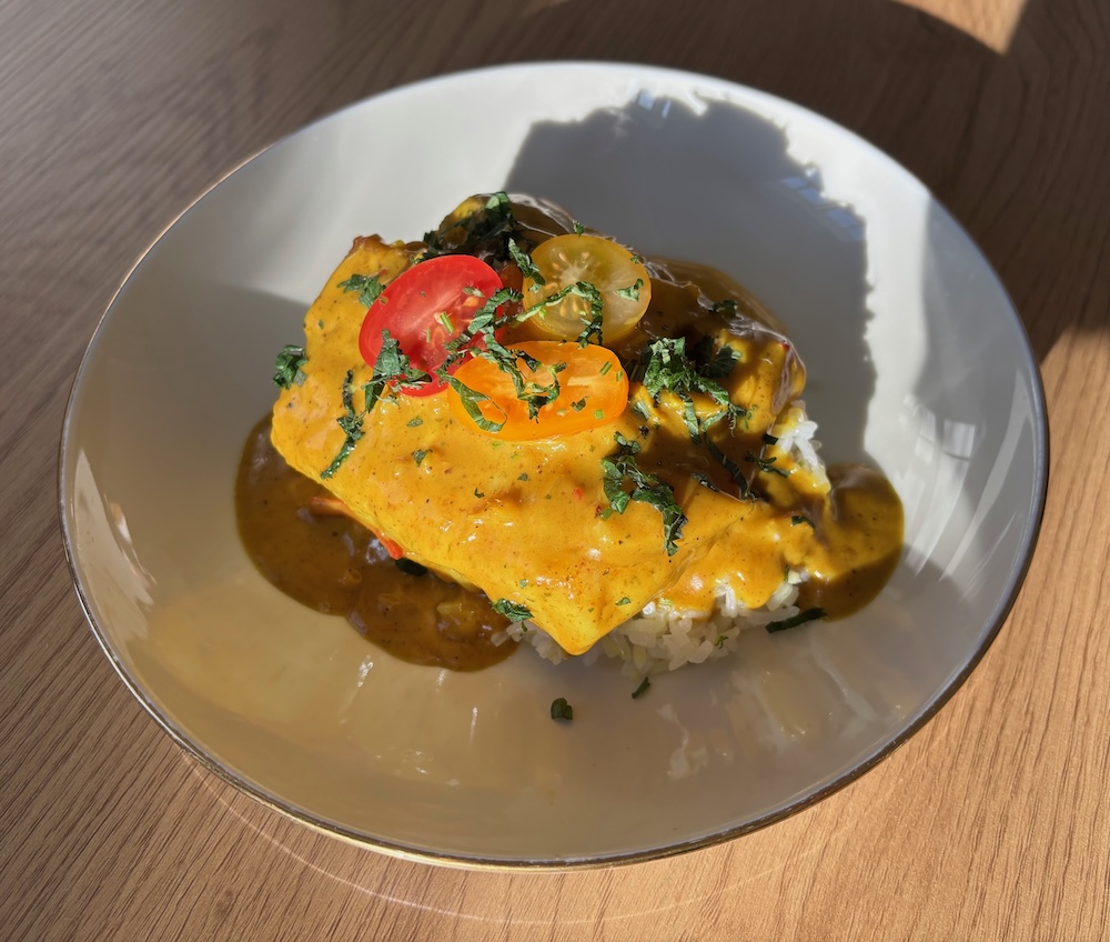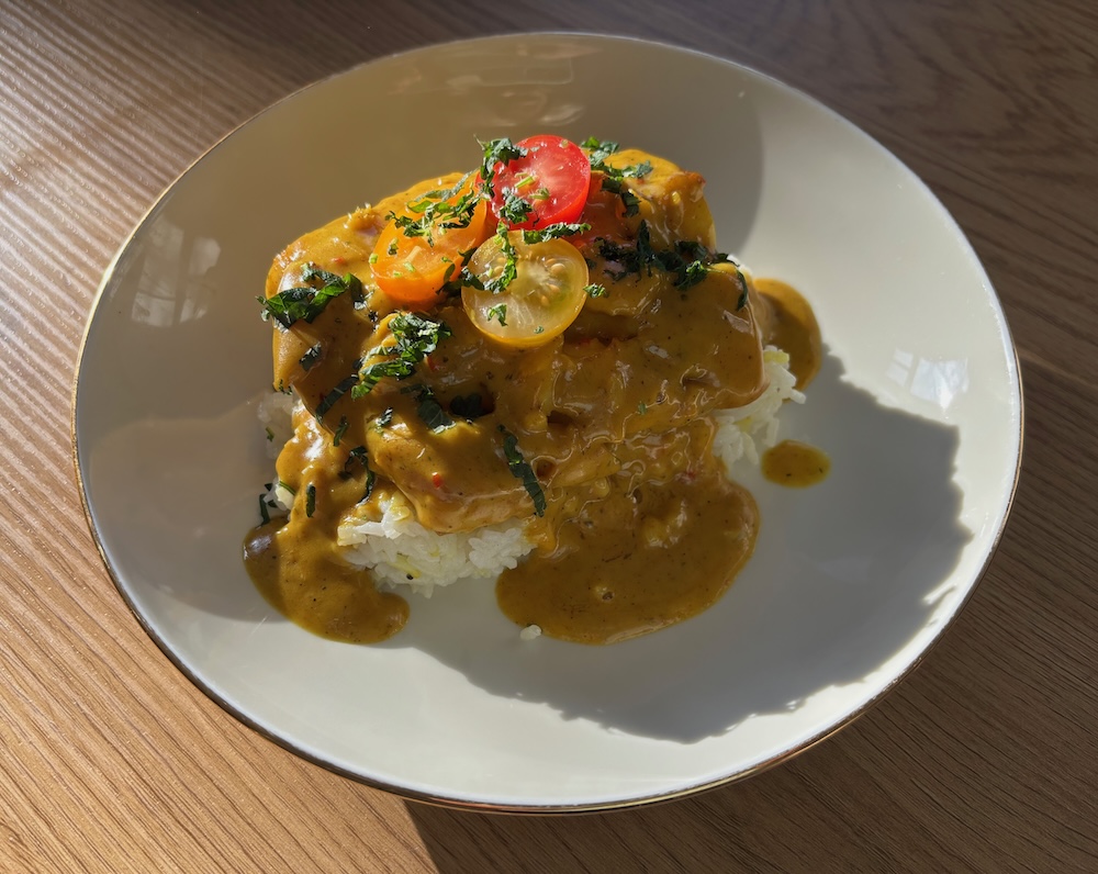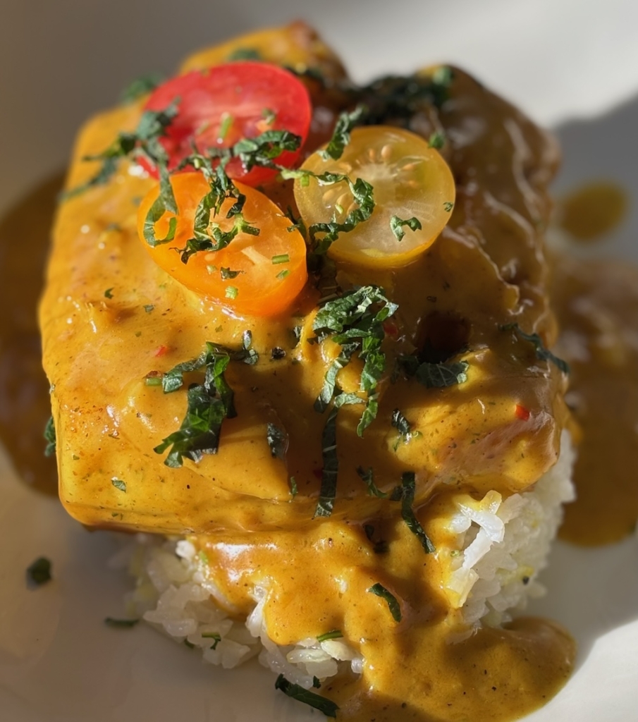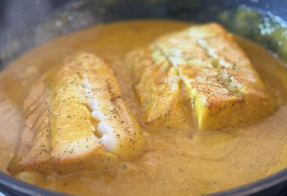 Pour in the oat cream (or coconut cream) and blend well. Add a bit of water if you think the sauce is too thick. Season to taste. Let the sauce simmer whilst frying the cod.