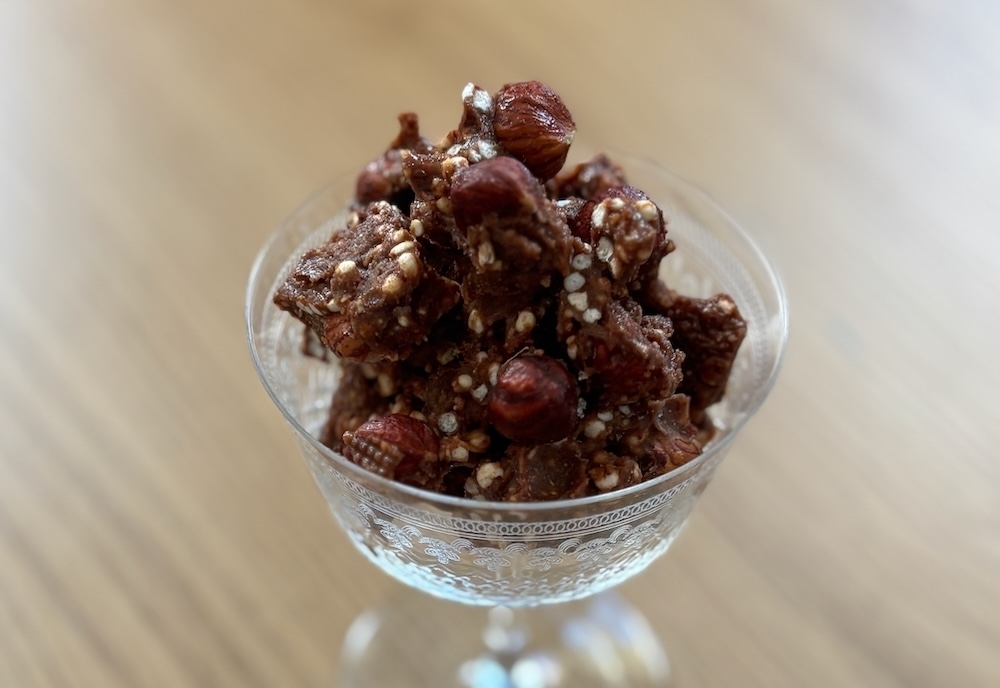 Ingredients 4 tbsp almond- and hazelnut butter from Monki 30 g vegan butter, block from Naturli 1-2 tbsp cocoa 1 tsp pure vanilla 1/2 tsp salt 2 tbsp yacon syrup 1 cup whole hazelnuts 1/2 cup popped quinoa Method On low heat melt the vegan butter and hazelnut- and almond butter together in a saucepan. […]